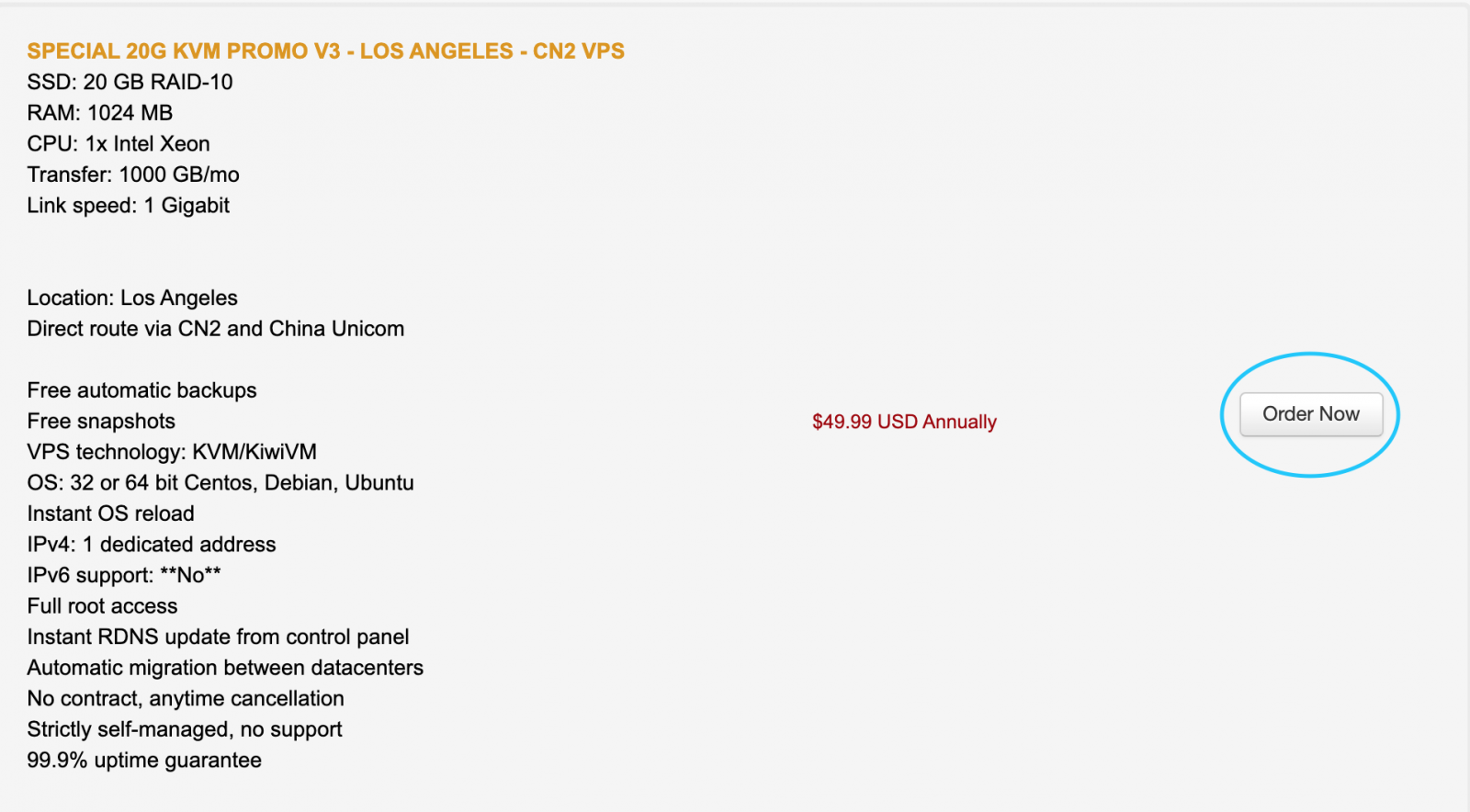 您也可以再次点击最上方的搬瓦工官网CN2地址,从中选择需要的CN2主机(可以用Ctrl F查找 CN2关键字),点击 Order Now之后也会进入到上面的页面。 这里就用第一个CN2套餐为例,点击【Order Now】,之后会进入上面的页面。